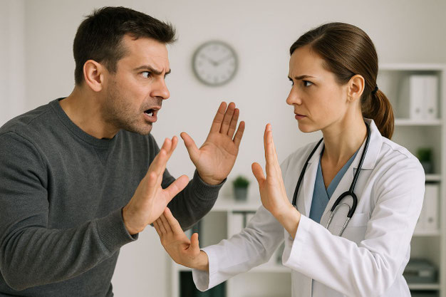 Beschimpfungen („Fehlbehandlung!“, „Sie verweigern mir das Medikament!“)